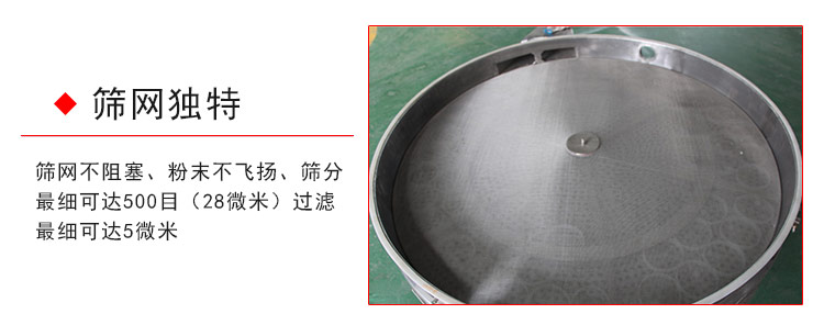 3.篩網(wǎng)不阻塞、粉末不飛揚、篩分可達(dá)500目(28微米)過濾可達(dá)5微米。