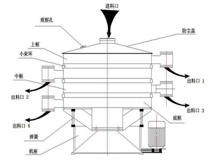 圓震動篩起動后,其動力裝置即振動電機上下兩端不同相位的偏心塊、由于高速放置作用而產生一復合慣性力,該慣性力強迫篩機振動體作復旋運動,篩框在振動力的作用下連續作往復運動,進地而帶動篩面作周期性振動,從而使篩面上的物料隨篩箱一同作定向踴躍式運動,其間,小于篩面孔徑的物料通過篩孔落到下層,成為篩下物,大于篩面孔徑的物料經連續跳躍運動后從排料口排出,完成篩分工作。