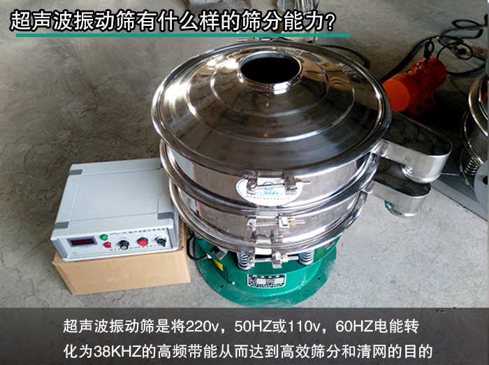 超聲波振動篩是將220v,50HZ或110v,60HZ電能轉化為38KHZ的高頻帶能,通過超聲換能器,將其變成38KHZ機械振動從而達到高效篩分和清網的目的。